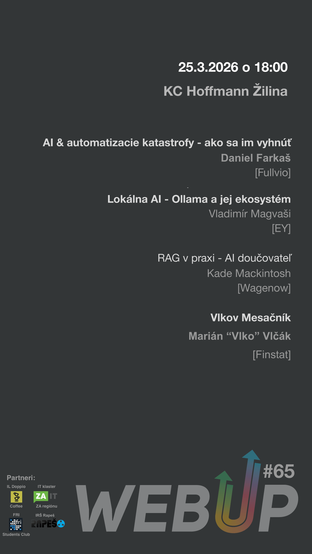 - WebUP#65 uz zajtra 25.03. AI & automatizacie katastrofy - ako sa im vyhnúť, Lokálna AI - Ollama a jej ekosystém, RAG v praxi, Vlko